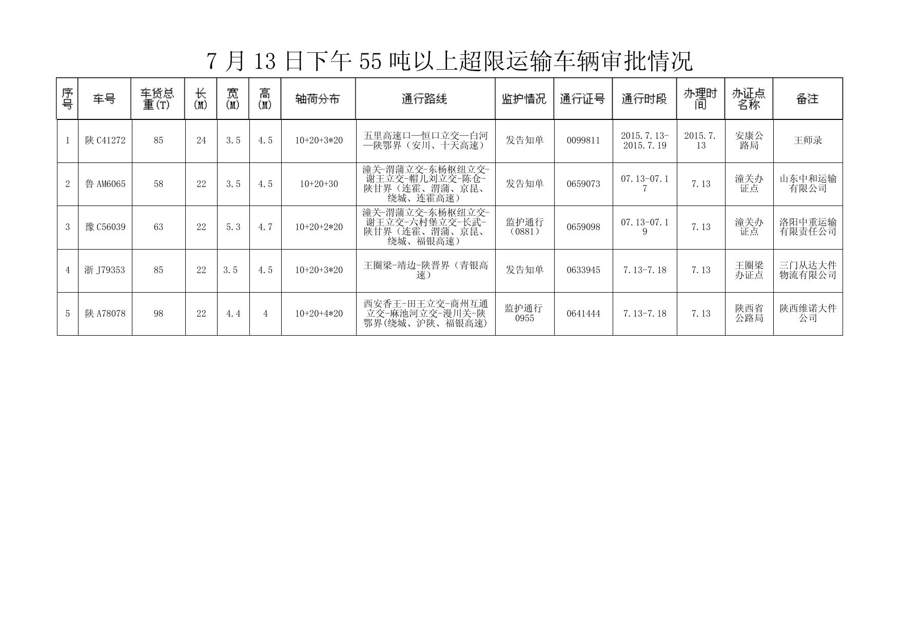 7 月 13 日下午 55 吨以上超限运输车辆审批情况