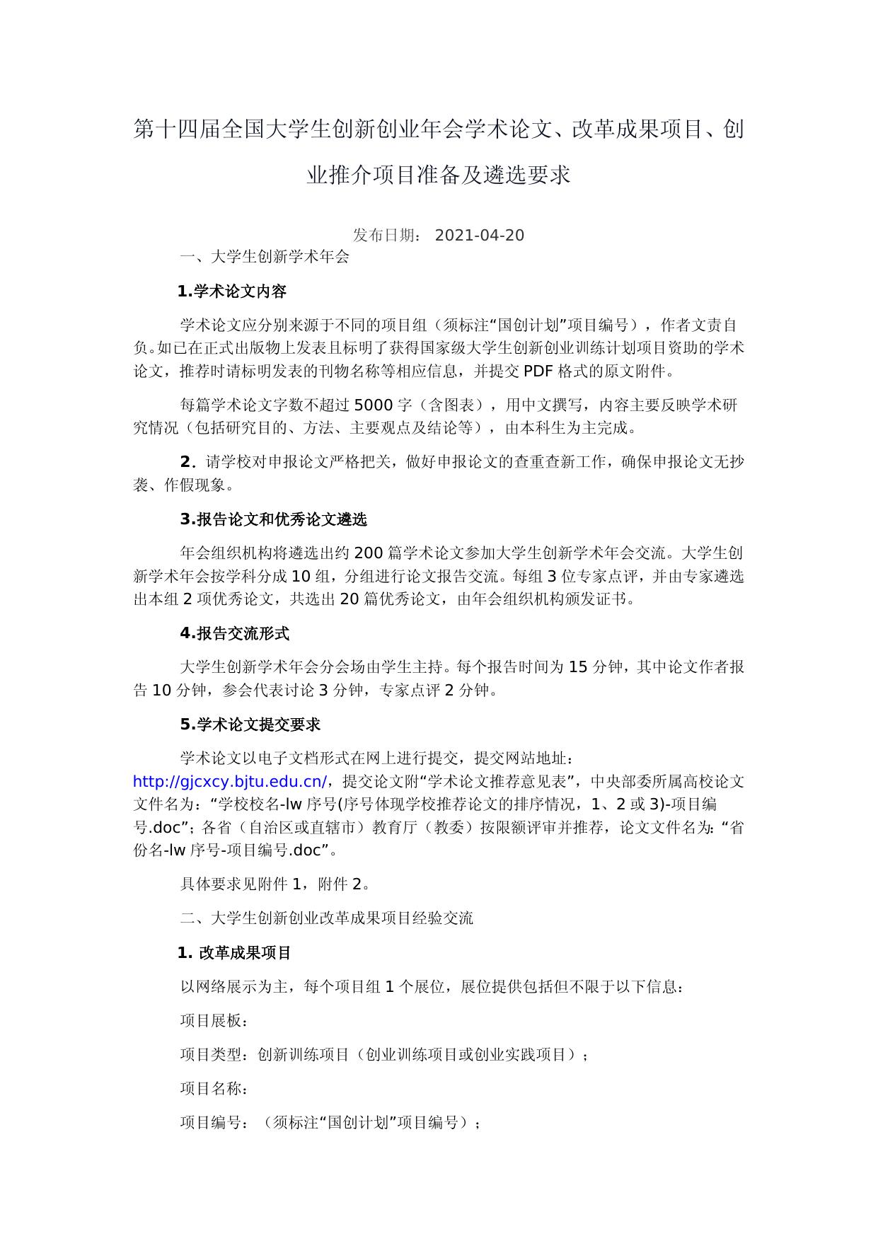 1.第十四届全国大学生创新创业年会学术论文、改革成果项目、创业推介项目准备及遴选要求.docx