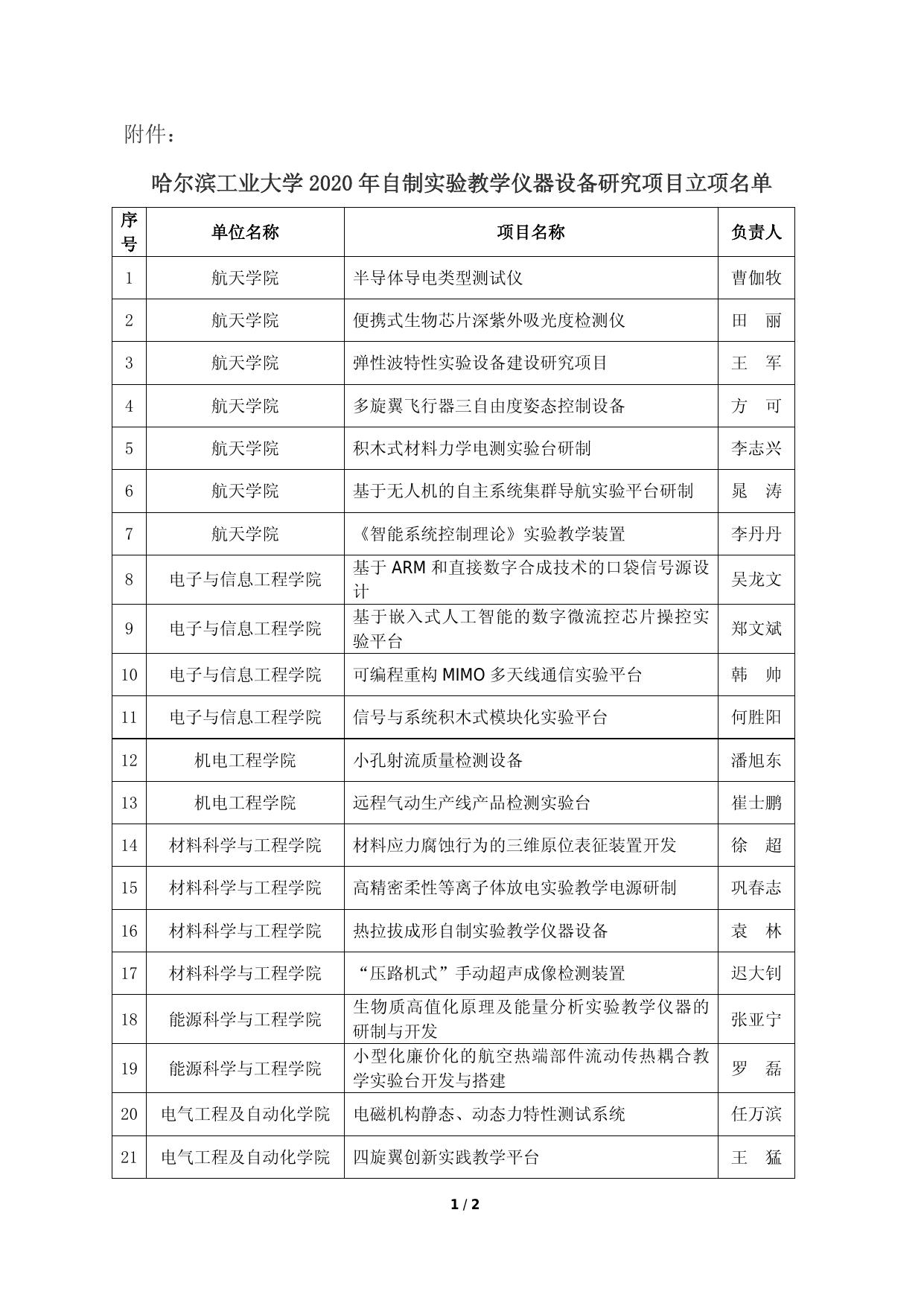 附件:哈尔滨工业大学2020年自制实验教学仪器设备研究项目立项名单.docx