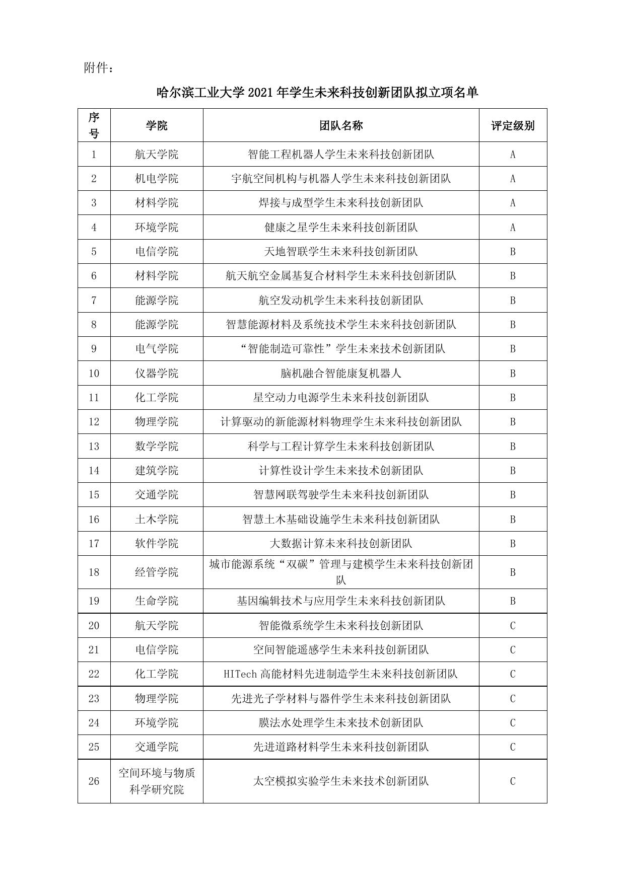 附件: 哈尔滨工业大学 2021 年学生未来科技创新团队拟立