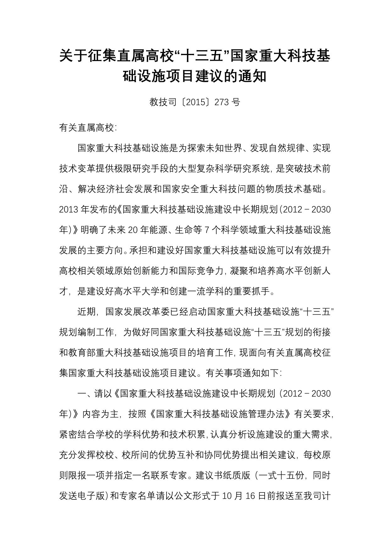 长安大学公路学院附件1:《关于征集直属高校“十三五”国家重大科技基础设施项目建议的通知》.docx