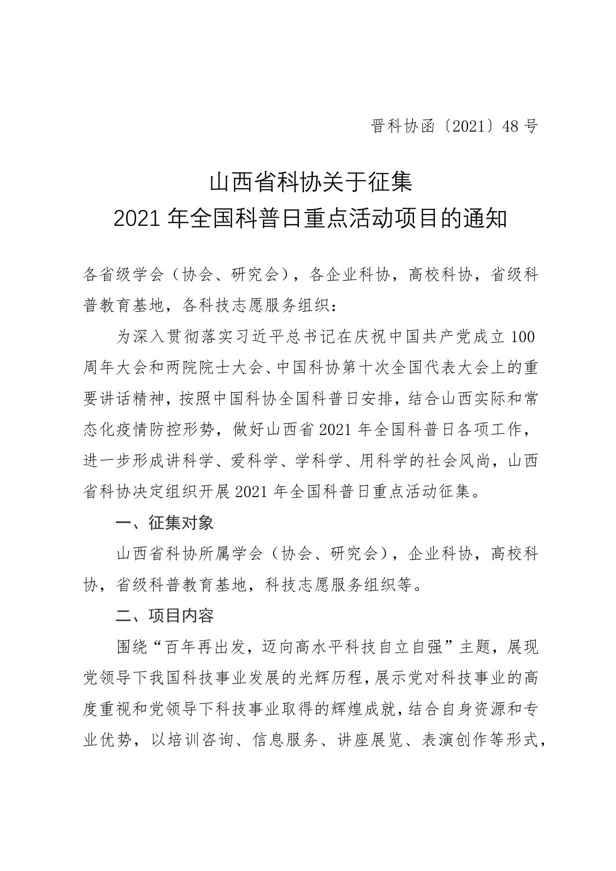 山西农业大学山西省科协关于征集2021年全国科普日重点活动项目的通知.docx