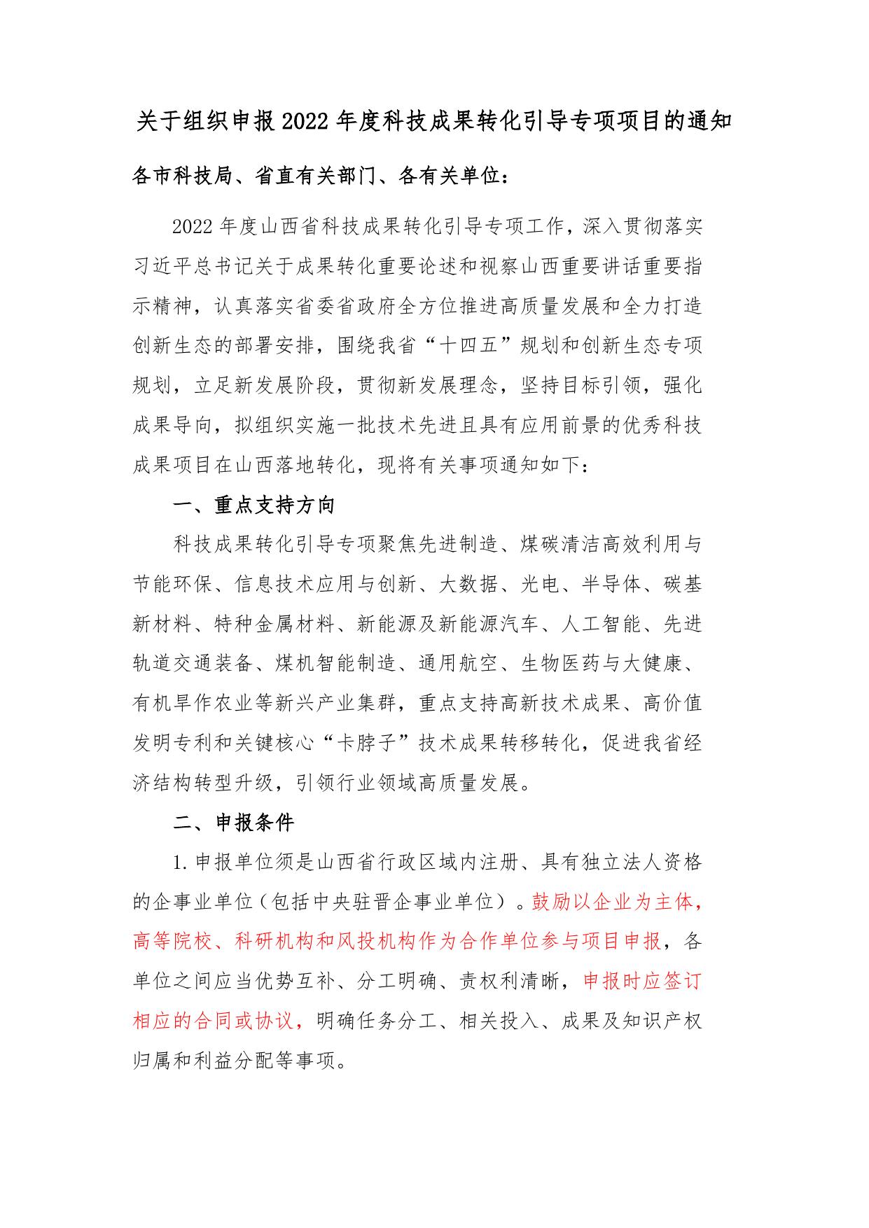 山西农业大学附件:山西省科学技术厅《关于组织申报2022年度科技成果转化引导专项项目的通知》.doc
