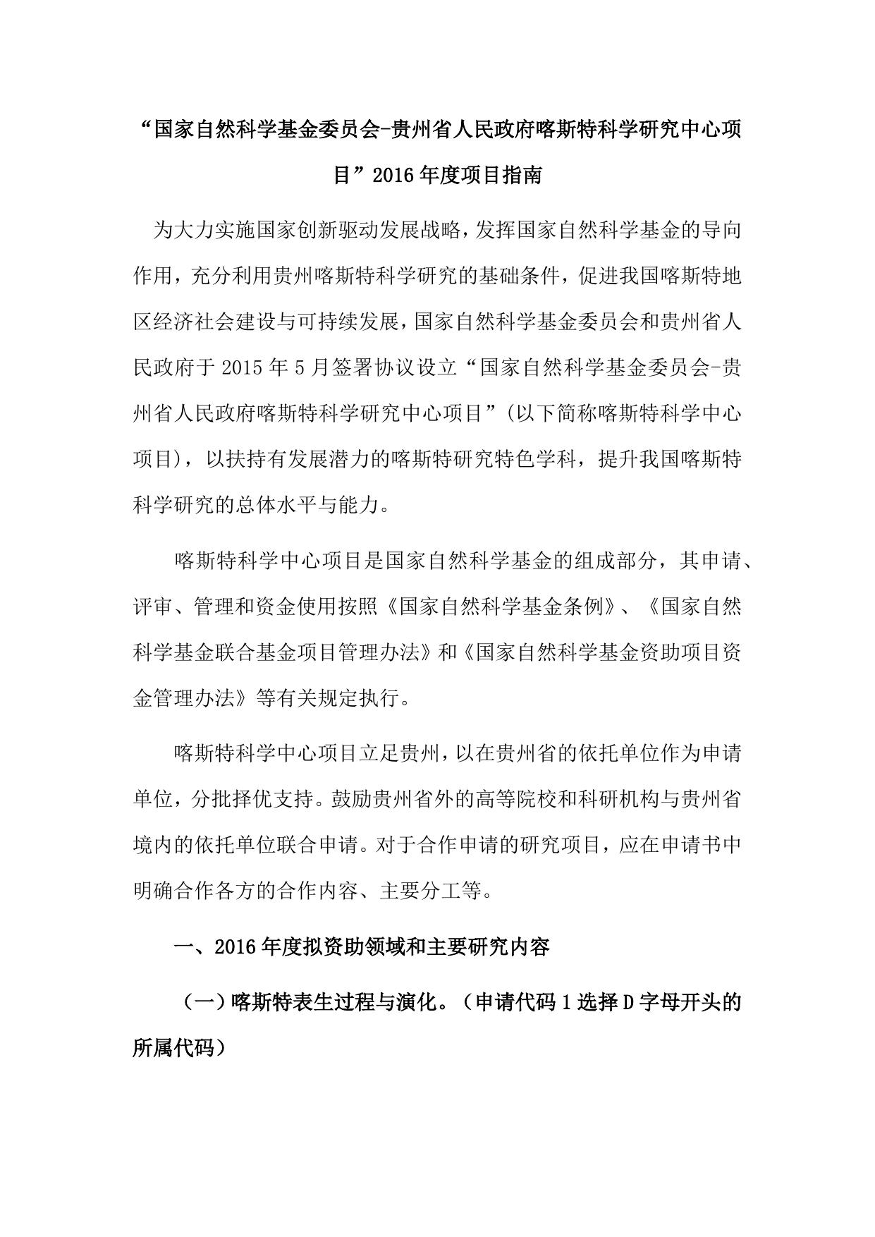 长安大学公路学院附件:“国家自然科学基金委员会-贵州省人民政府喀斯特科学研究中心项目”2016年度项目指南.docx