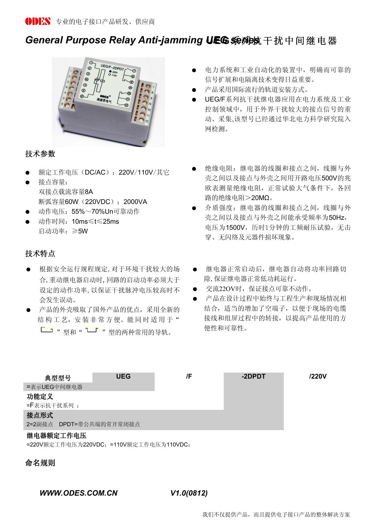 澳德思UEGF-2DPDT220V系列抗干扰继电器说明书