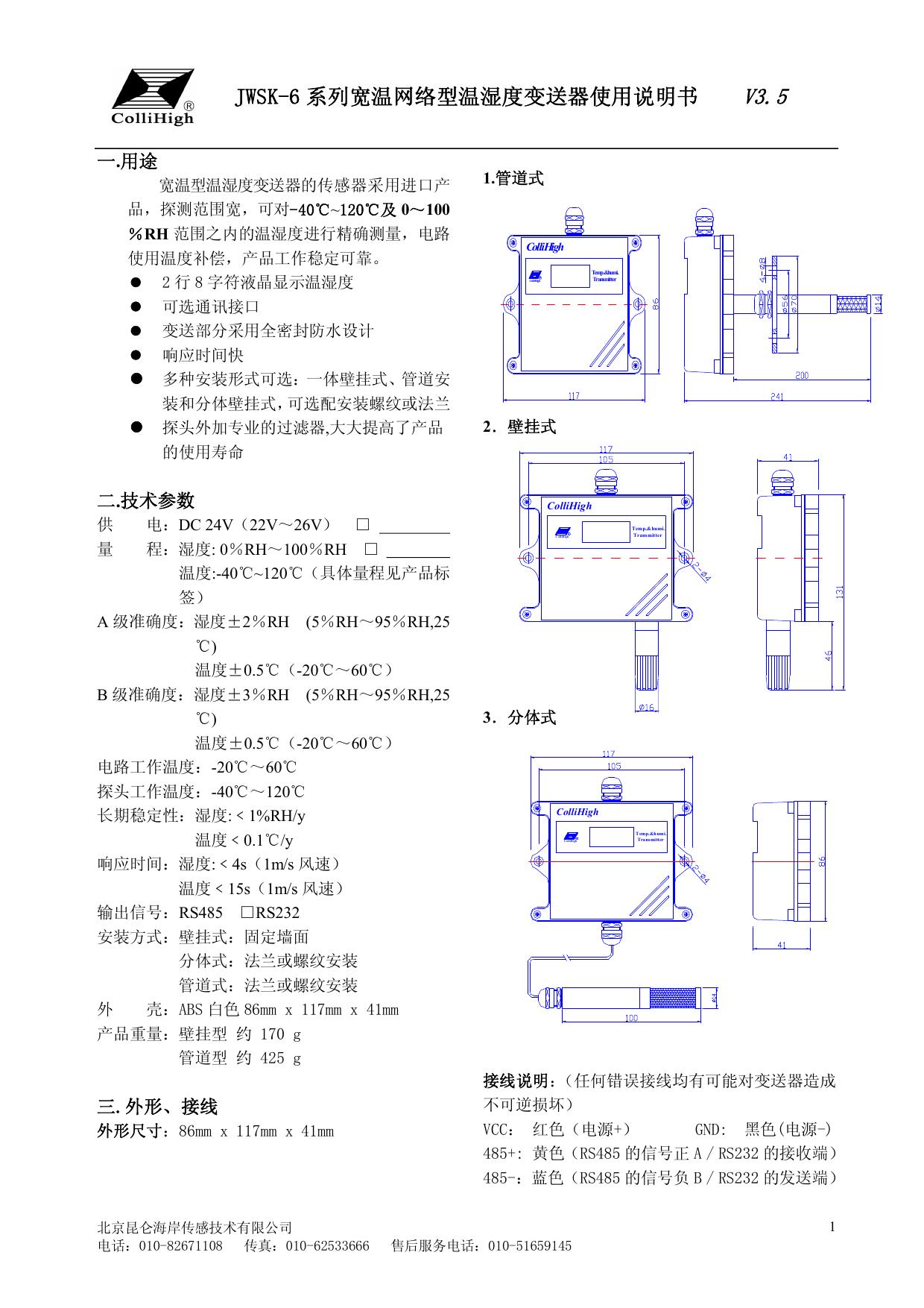昆仑海岸 JWSK-6系列宽温网络型温湿度变送器 使用说明书