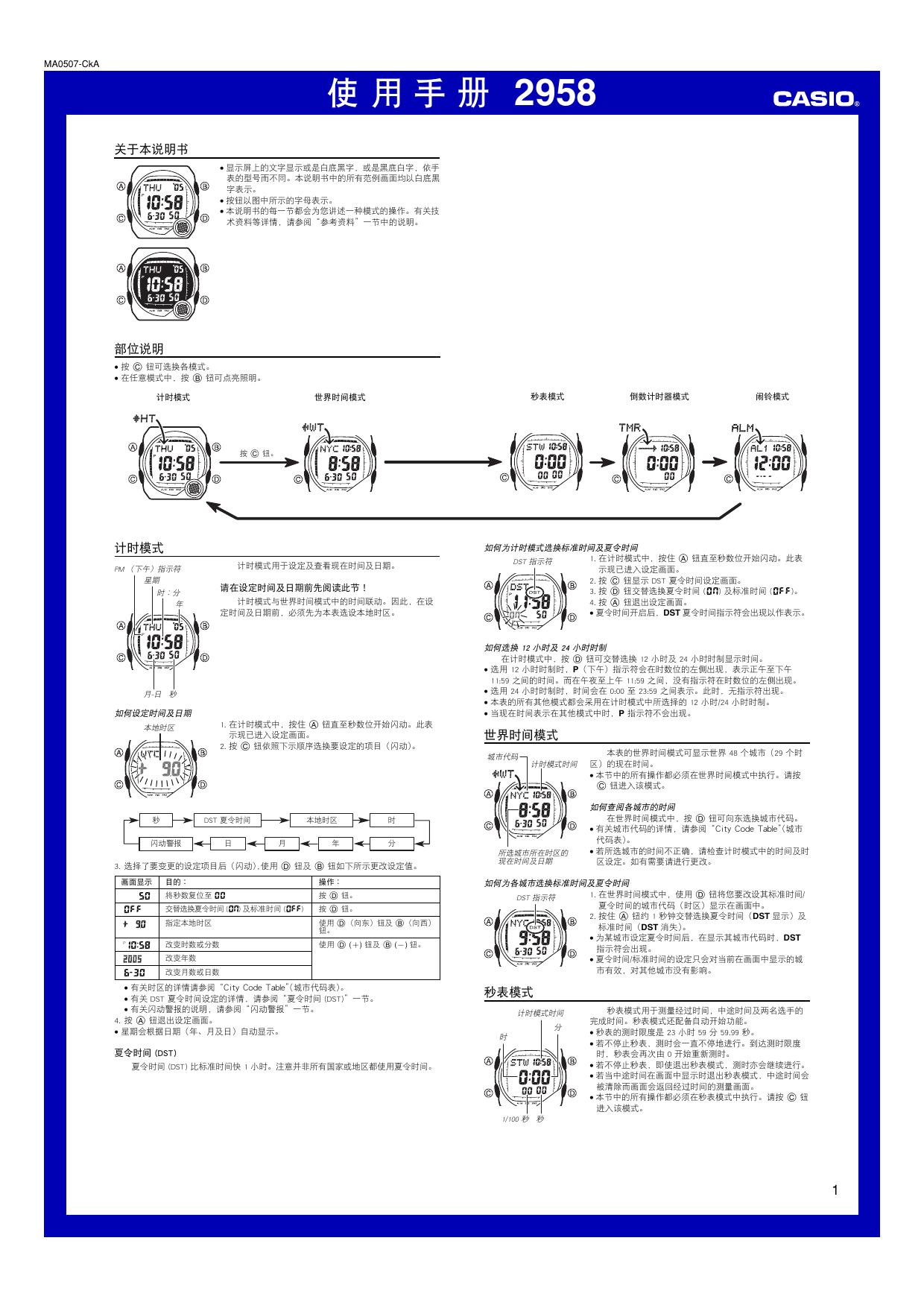 卡西欧 机芯型号:2958手表说明书