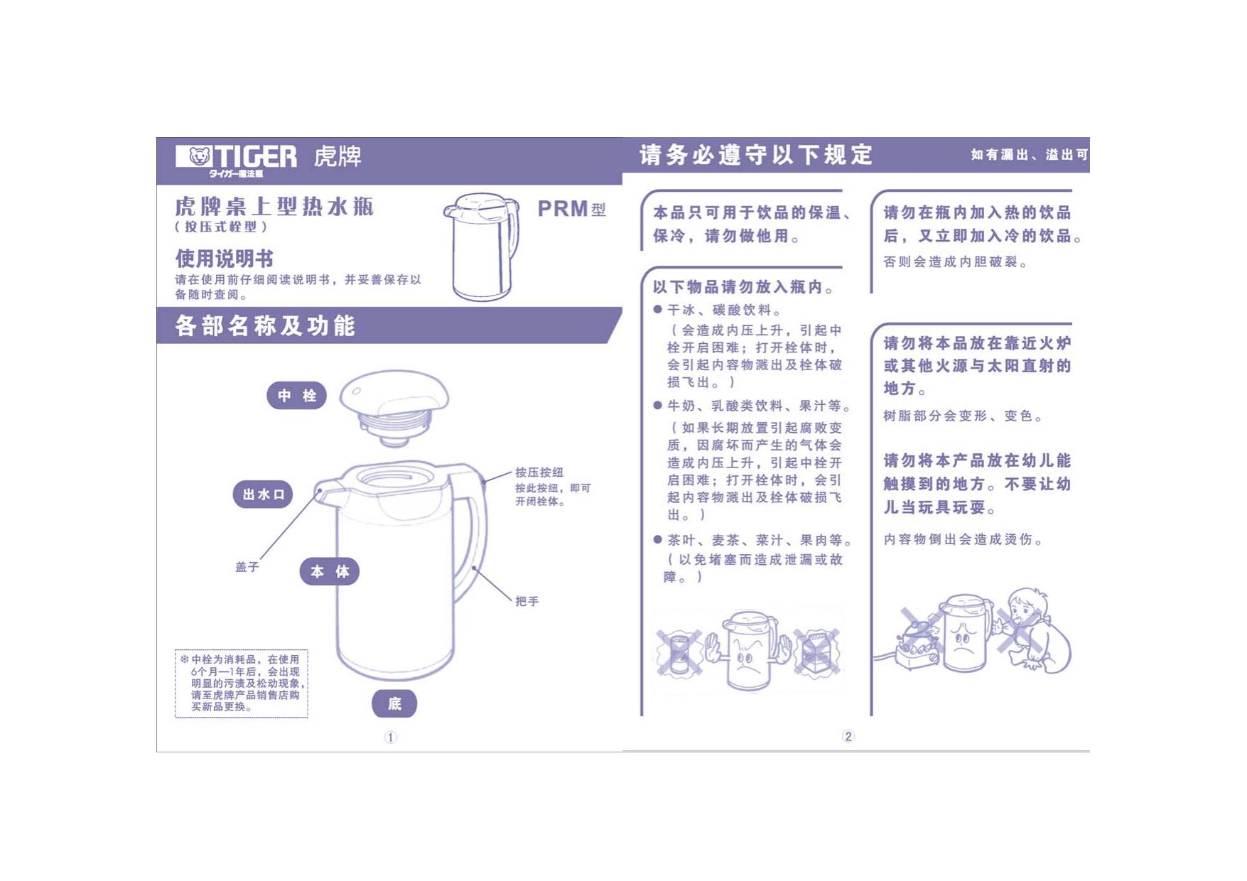 虎牌 PRM-A190型(把手按压式)桌上热水瓶 使用说明书