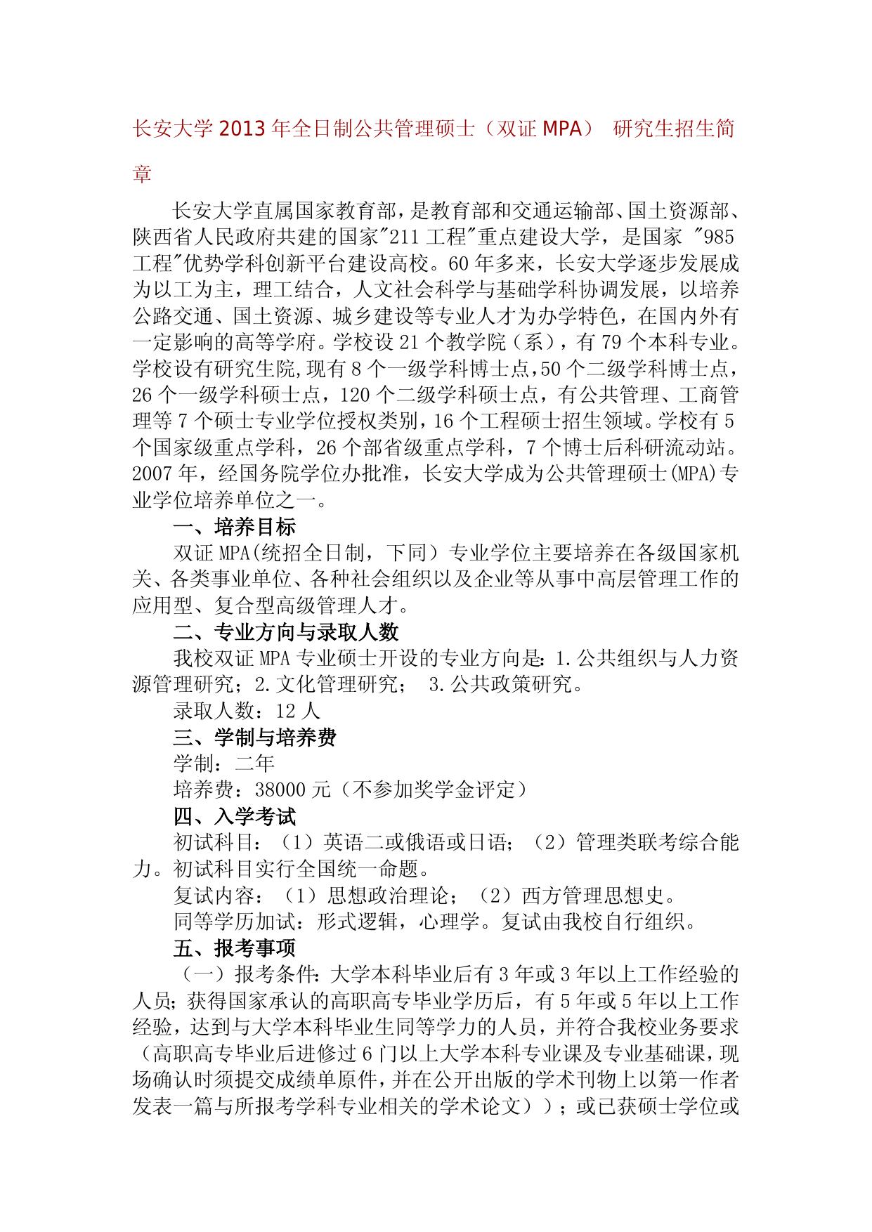 长安大学2013年公共管理硕士招生简章(双证).doc