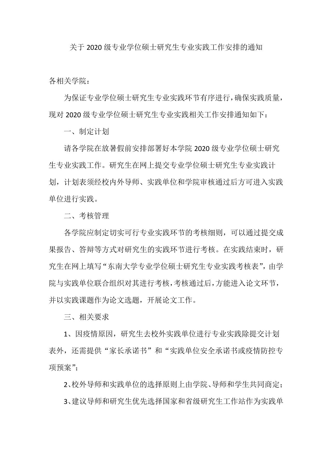 关于2020级专业学位硕士研究生专业实践工作安排通知