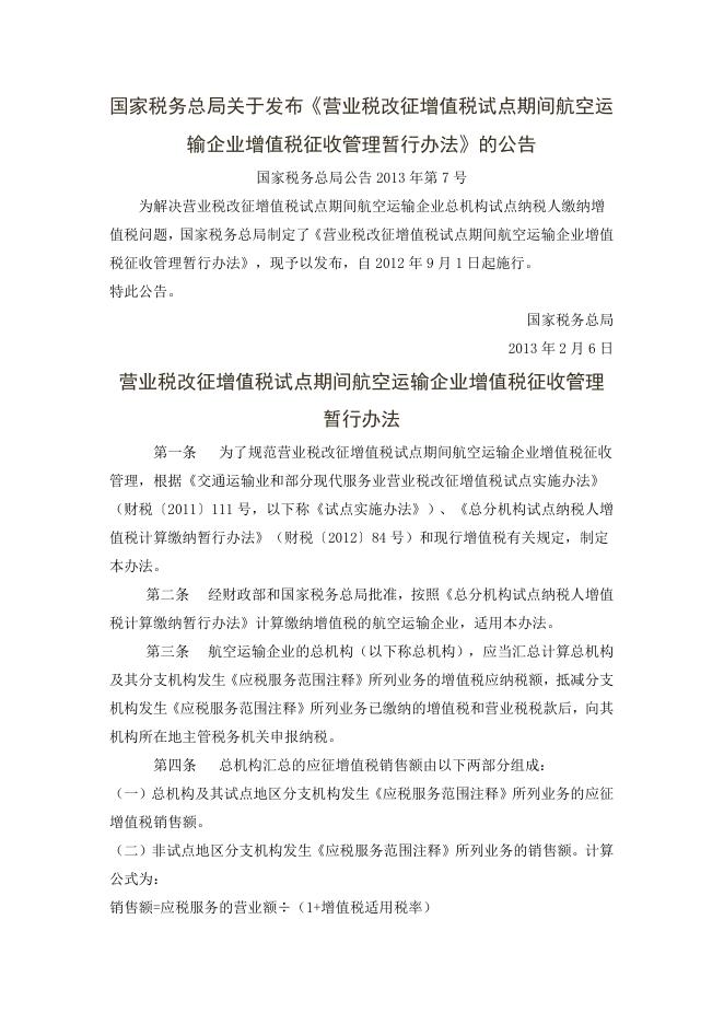 关于发布《营业税改征增值税试 点期间航空运输企业增值税征 收管理暂行办法》的公告.docx