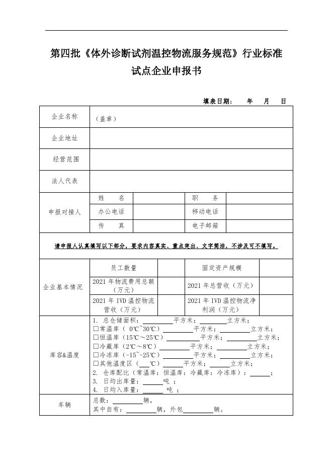 附件1:第四批《体外诊断试剂温控物流服务规范》行业标准试点企业申报书.doc