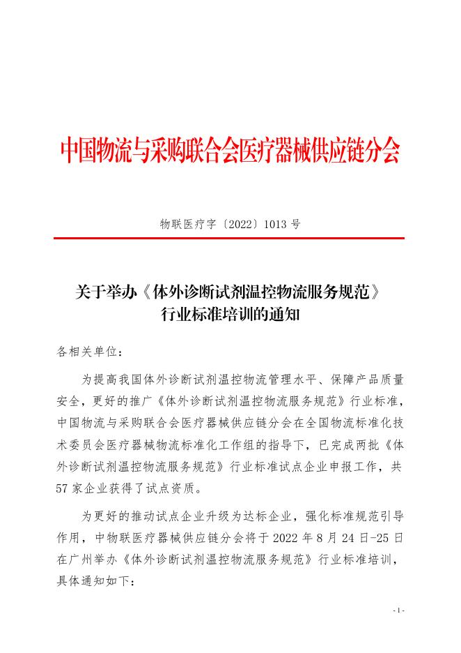 附件1:关于举办《体外诊断试剂温控物流服务规范》行业标准培训的通知.pdf