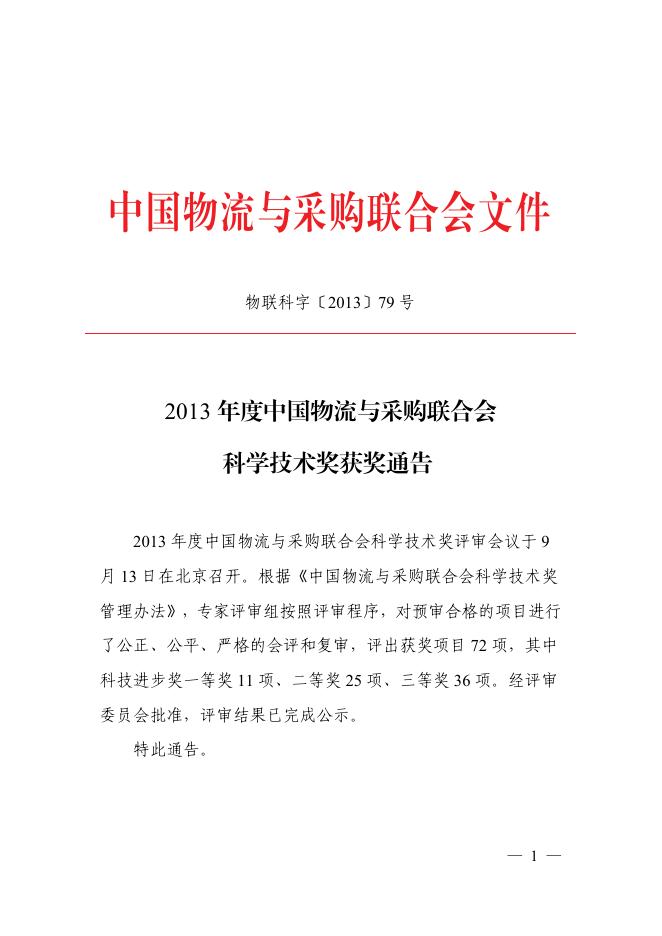 关于2013年度中国物流与采购联合会科学技术奖获奖项目的通告.pdf