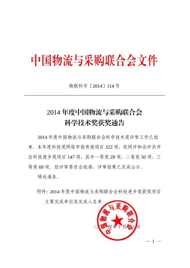 关于2014年度中国物流与采购联合会科学技术奖获奖项目的通告.pdf