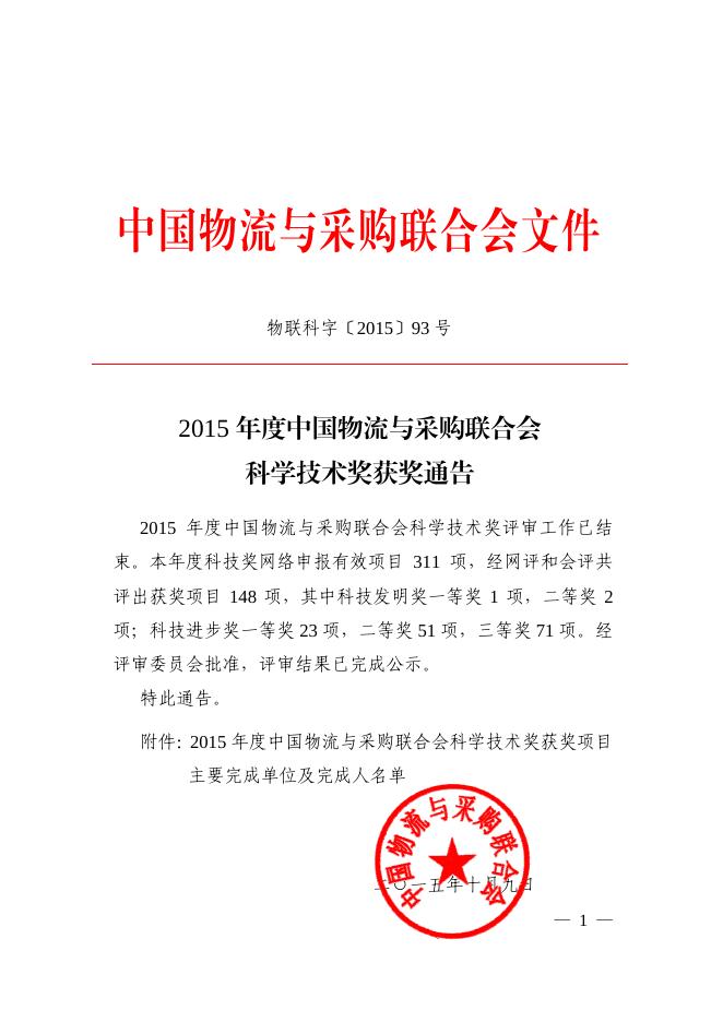 关于2015年度中国物流与采购联合会科学技术奖获奖项目的通告.pdf