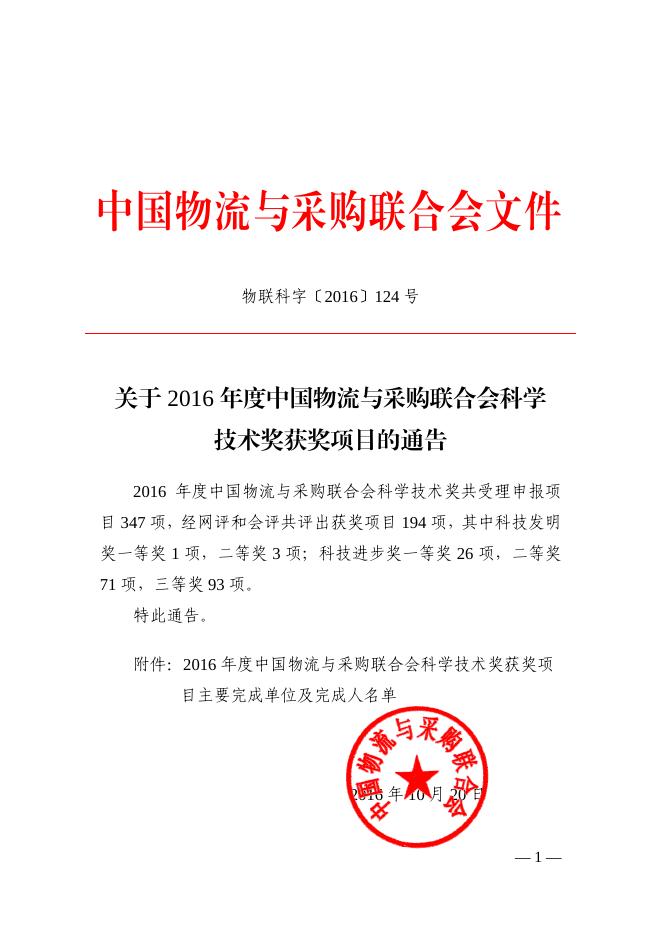 关于2016年度中国物流与采购联合会科学技术奖获奖项目的通告.pdf