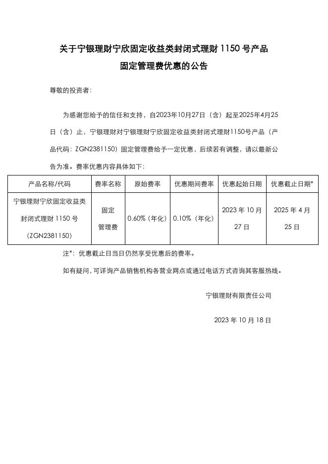 关于宁银理财宁欣固定收益类封闭式理财1150号产品固定管理费优惠的公告.pdf