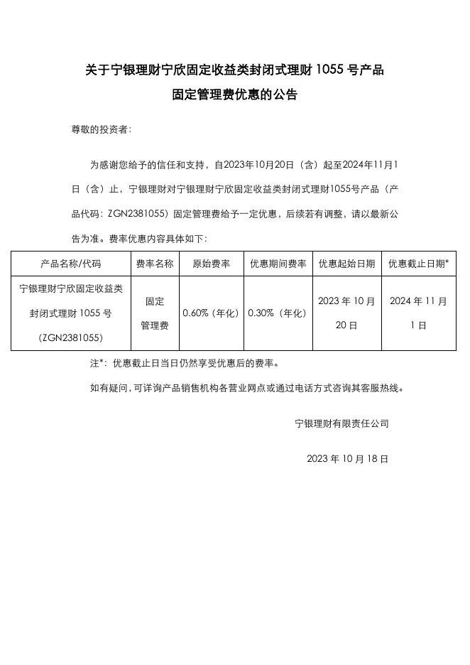 关于宁银理财宁欣固定收益类封闭式理财1055号产品固定管理费优惠的公告.pdf