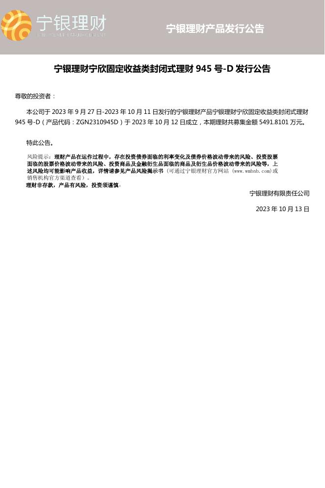 宁银理财宁欣固定收益类封闭式理财945号-D发行公告.pdf