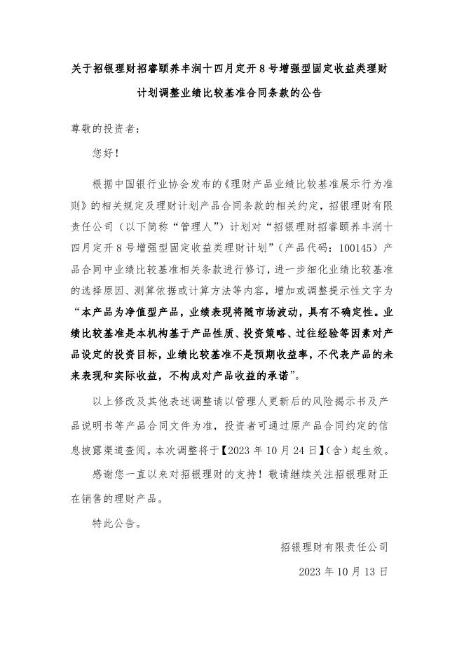 关于招银理财招睿颐养丰润十四月定开8号增强型固定收益类理财计划调整业绩比较基准合同条款的公告.pdf