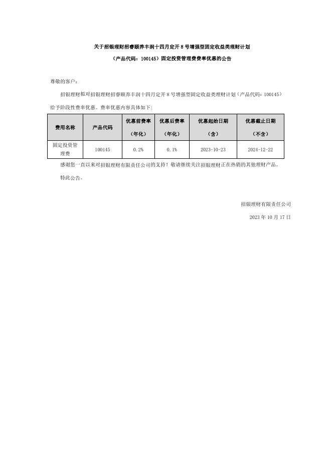 关于招银理财招睿颐养丰润十四月定开8号增强型固定收益类理财计划(产品代码:100145)固定投资管理费费率优惠的公告.pdf