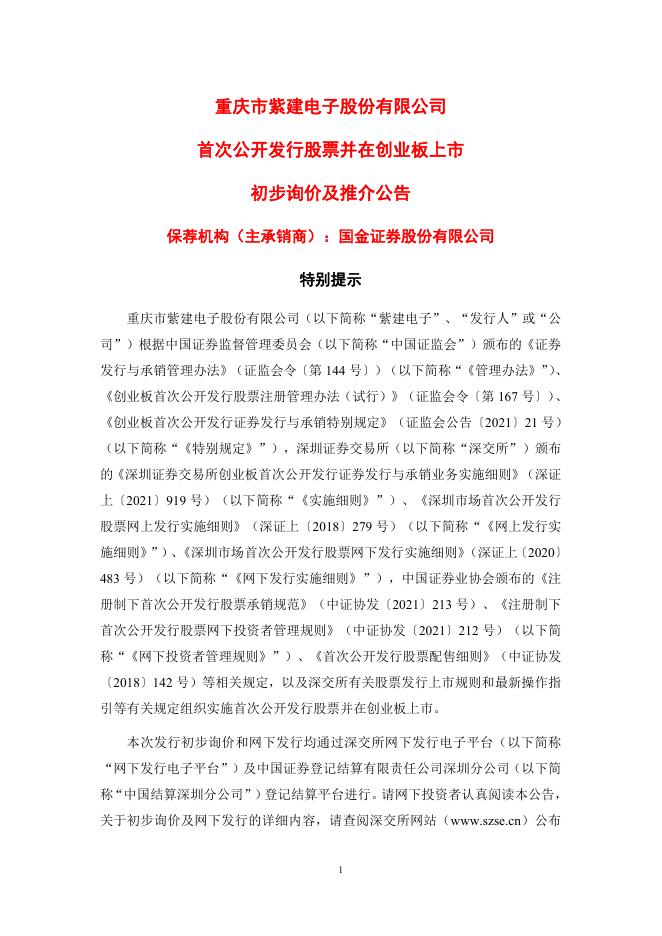 紫建电子:首次公开发行股票并在创业板上市初步询价及推介公告.PDF