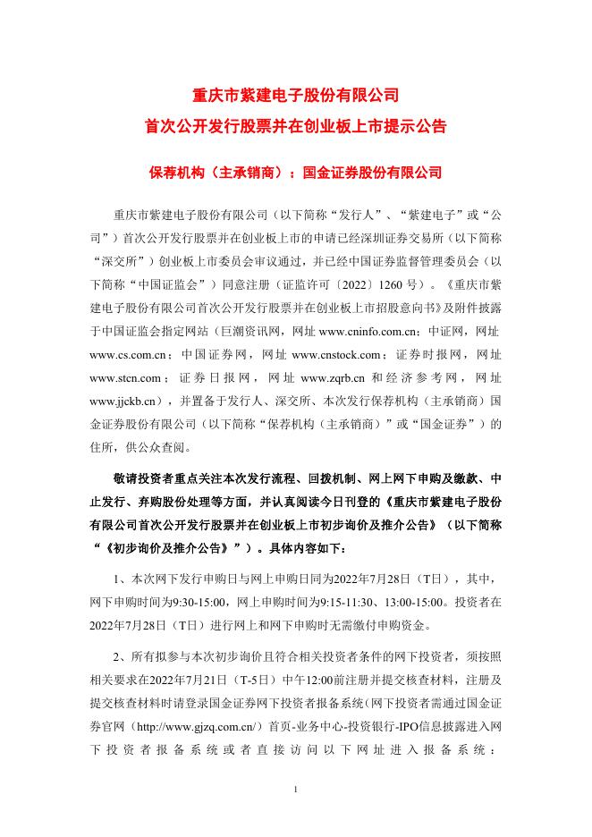 紫建电子:首次公开发行股票并在创业板上市提示公告.PDF