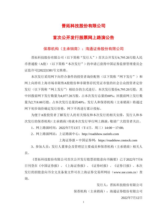 晋拓股份:晋拓股份首次公开发行股票网上路演公告.PDF