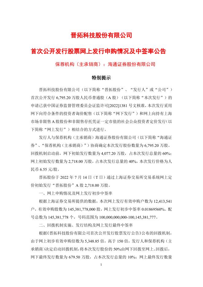 晋拓股份:晋拓股份首次公开发行股票网上发行申购情况及中签率公告.PDF