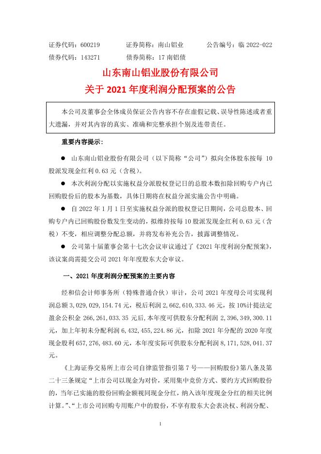 南山铝业:山东南山铝业股份有限公司关于2021年度利润分配预案的公告.PDF