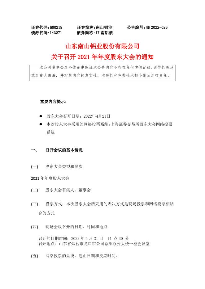 南山铝业:山东南山铝业股份有限公司关于召开2021年年度股东大会的通知.PDF