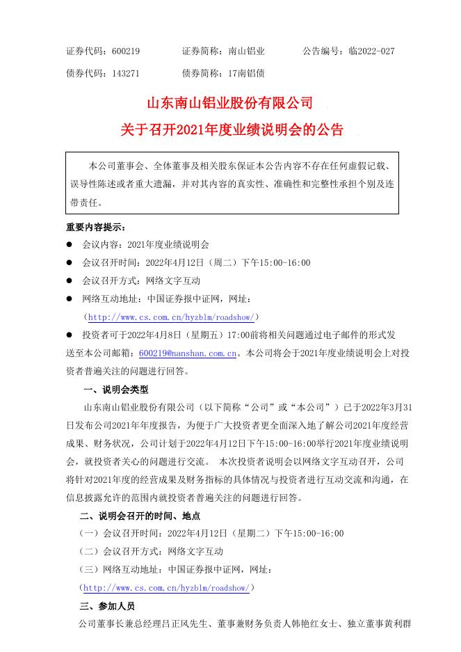 南山铝业:山东南山铝业股份有限公司关于召开2021年度业绩说明会的公告.PDF